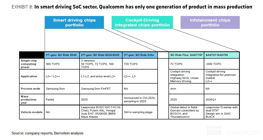 高通下一代智驾芯片侧重 “舱驾一体”,把驾驶和座舱集成到一颗 SoC 中(如规划中的 SA8797/SA8799 等),将于 2026 年一季度量产。目前的定点车型为零跑 D 系列(搭载双 8797 芯片),未来大芯片市场可能有机会。