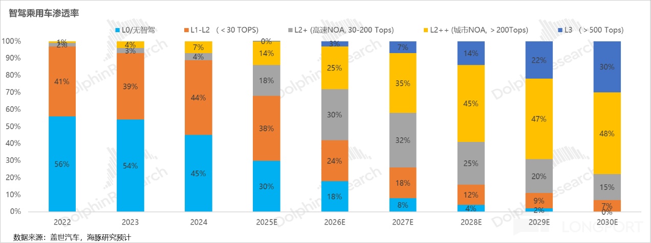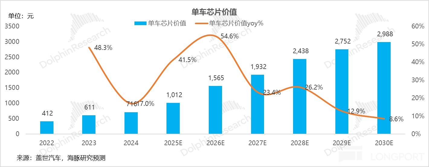 海豚君预计单车芯片价值将在 2030 年增长至近 3000 元,主要由大算力芯片占比的提升所带动(200 TOPS 以上芯片占比达到 78%)。