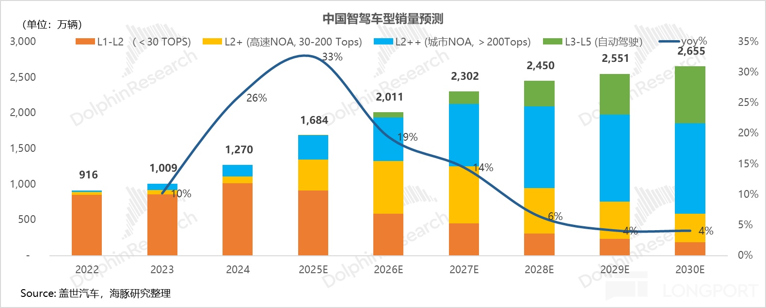 从销量维度来看:2024 年中国乘用车销量 2310 万辆,智驾渗透率 55%。海豚君预测到 2030 年,智能驾驶渗透率将达 100%,其中 L2+ 及以上渗透率达 93%(对应约 2655 万辆智驾车辆)。