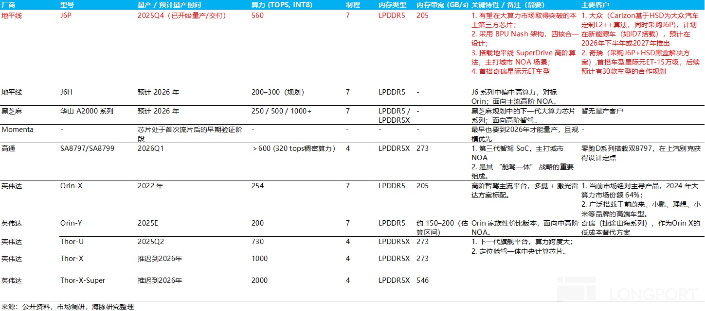 ③ 挑战者:地平线,黑芝麻,高通,Momenta 等。其中,地平线旗舰产品(如 J6P)已具备挑战高端市场的算力水平(560 TOPS),而挑战者也是未来格局最大变数。