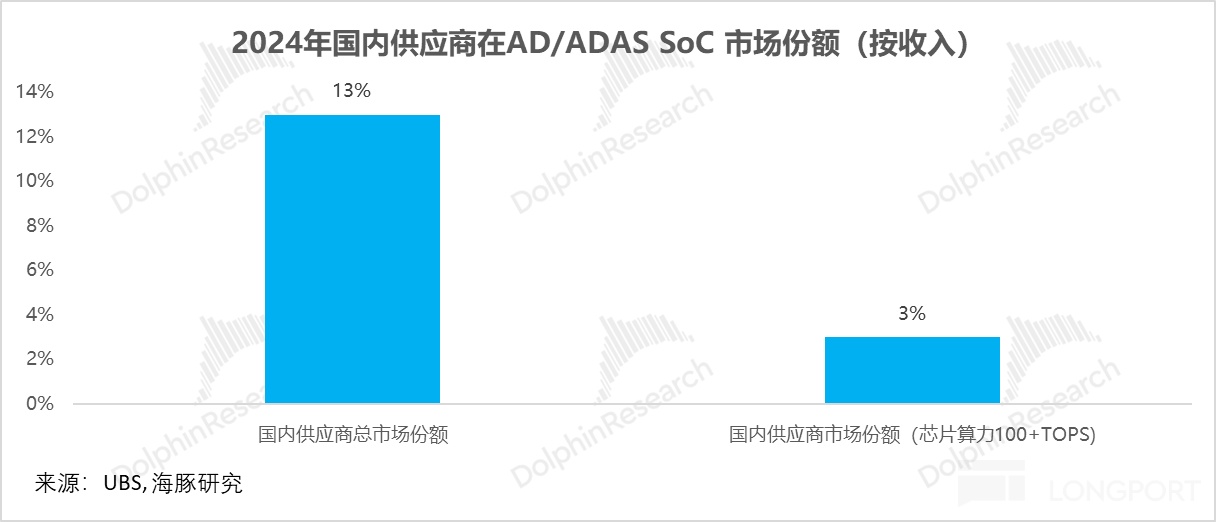 2024 年,国内供应商的收入在中国车厂 AD/ADAS SoC 市场总规模中占比仅 13%,主要是高单价中高端芯片市场(100+ TOPS)是英伟达等主导,导致国内供应商的份额被挤压至仅 3%。因此,攻克并占领大算力市场,也已成为国产芯片实现替代、获取增长的关键路径。