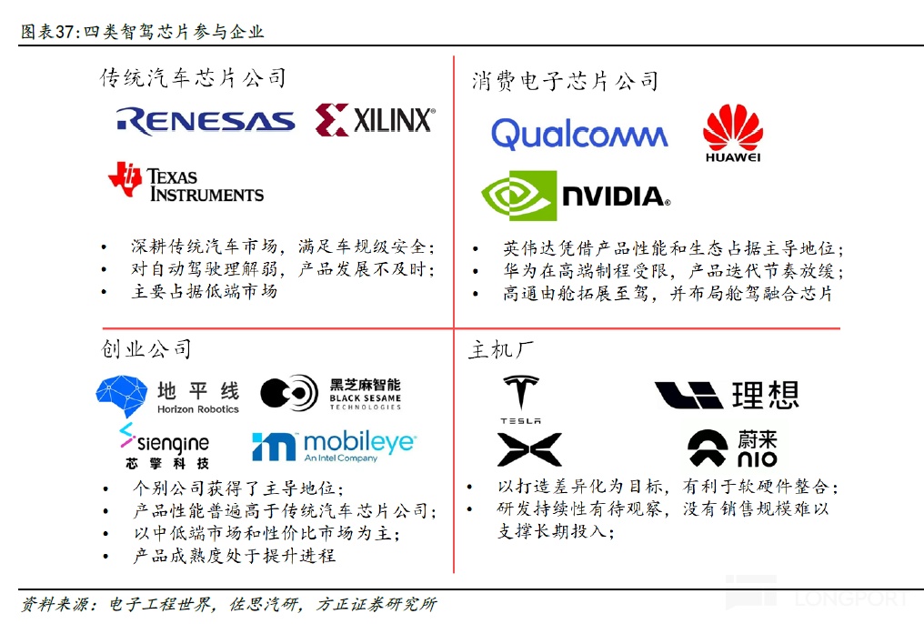 ① 传统汽车芯片公司:瑞萨、赛灵思、德州仪器等,原本是微控制器(MCU)、功率半导体、传感器、电源管理芯片等。优势在传统汽车电子基础,能满足车规级安全。但劣势在 AI 能力偏弱且产品迭代速度慢,对数据驱动的智能驾驶场景理解不足,因此产品在 L2 及以下的低端市场。