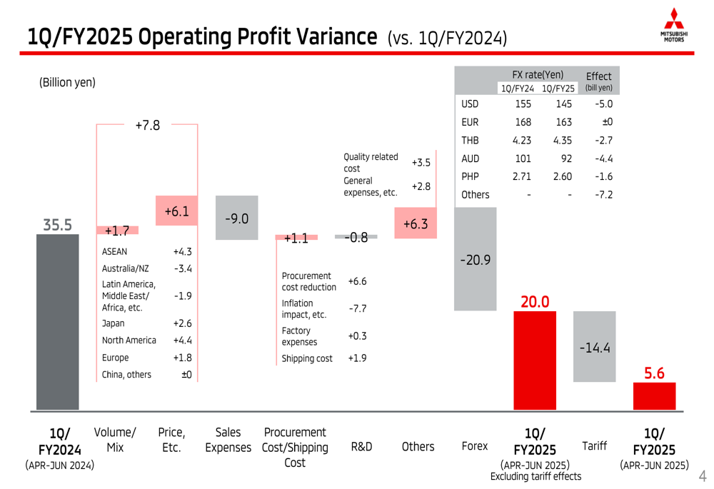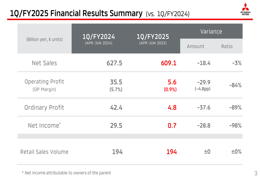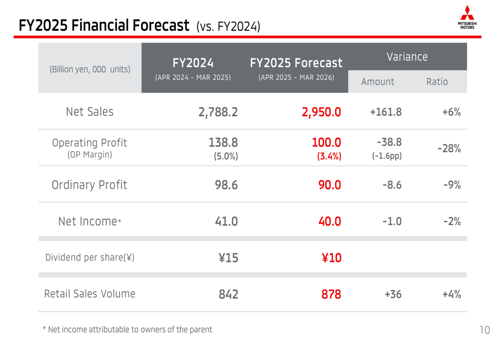 尽管第一季度充满挑战,三菱仍维持其2025财年的全年预测。公司预计净销售额将增长6%至¥2.95万亿,零售销量增长4%至87.8万辆。然而,营业利润预计将下降28%至¥1000亿,利润率从5.0%收缩至3.4%。