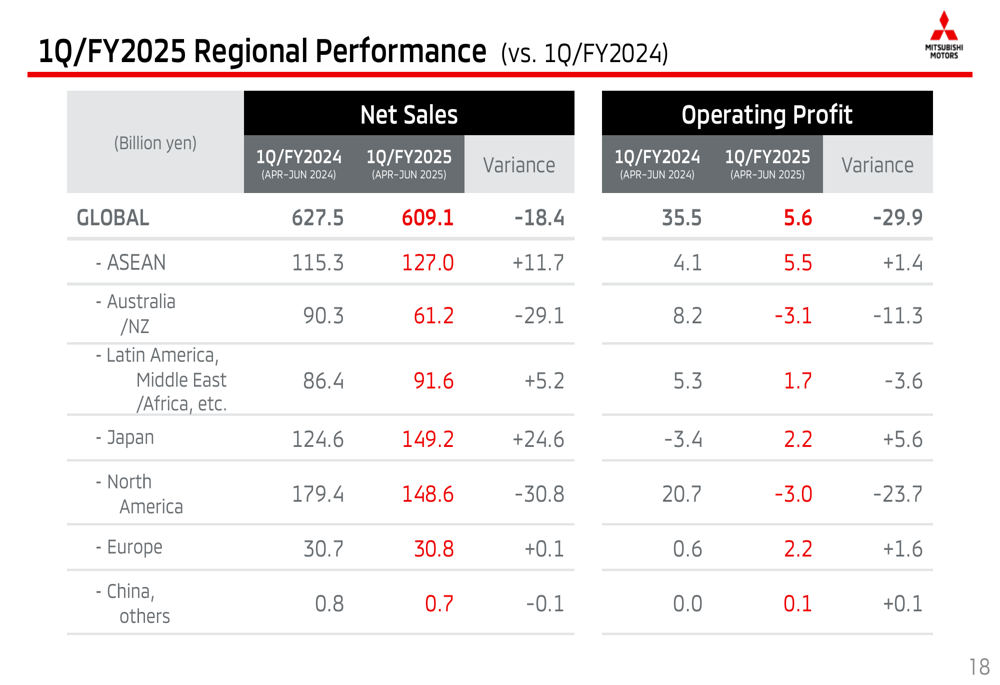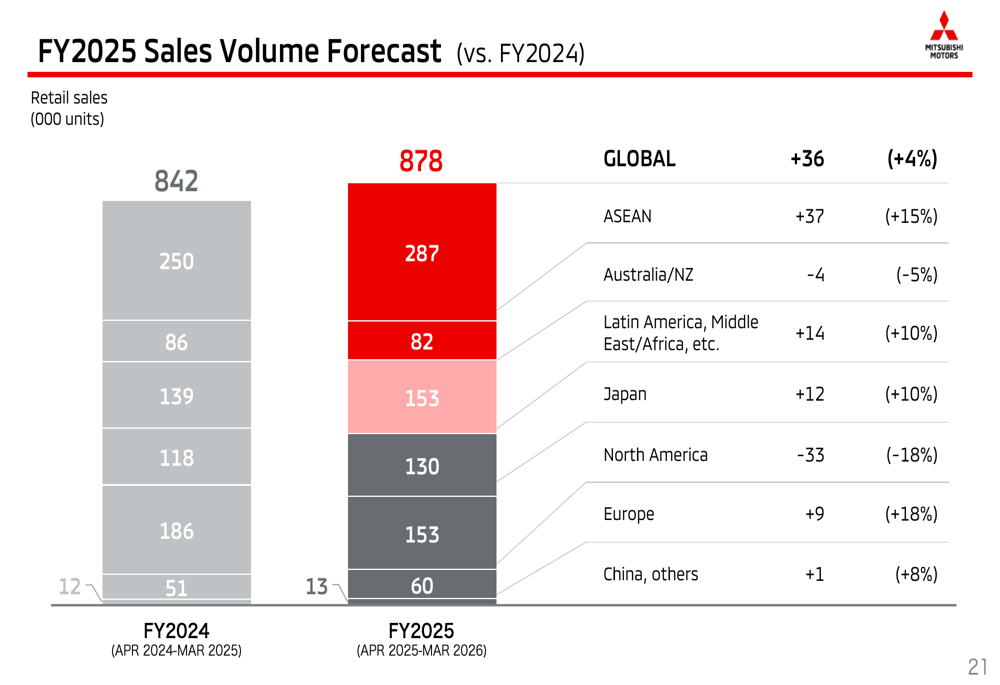 三菱全球零售销量保持稳定在19.4万辆,但这一稳定掩盖了各区域间的显著差异。日本市场表现最强劲,增长22%(2.8万辆),北美增长5%(4.2万辆)。拉丁美洲、中东和非洲地区合计增长10%(3.4万辆)。