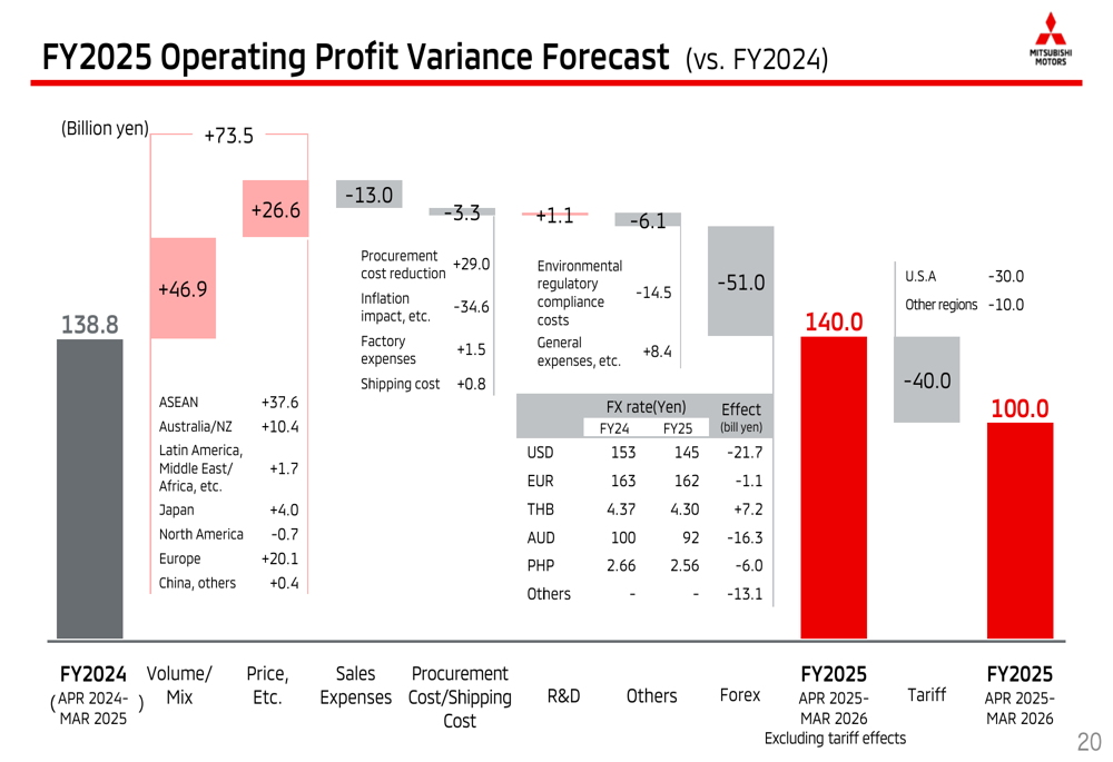 公司全年营业利润预测显示,汇率(-¥510亿)和关税(-¥400亿)的负面影响将持续,不过这些预计将部分被销量/结构改善(+¥735亿)和定价(+¥266亿)所抵消: