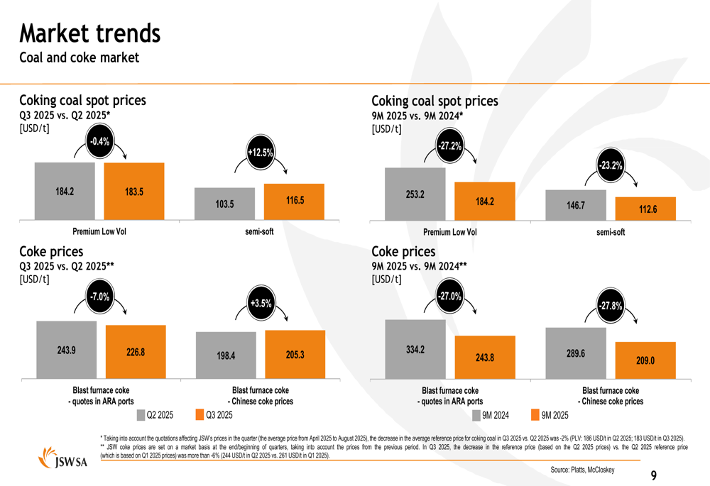 具有挑战性的市场环境继续对JSW的业绩施加压力。全球钢铁产量从2025年第二季度的4.657亿吨下降至第三季度的4.395亿吨,而欧盟产量从3300万吨下降至2920万吨。这种产量下降直接影响了对JSW焦煤和焦炭产品的需求。