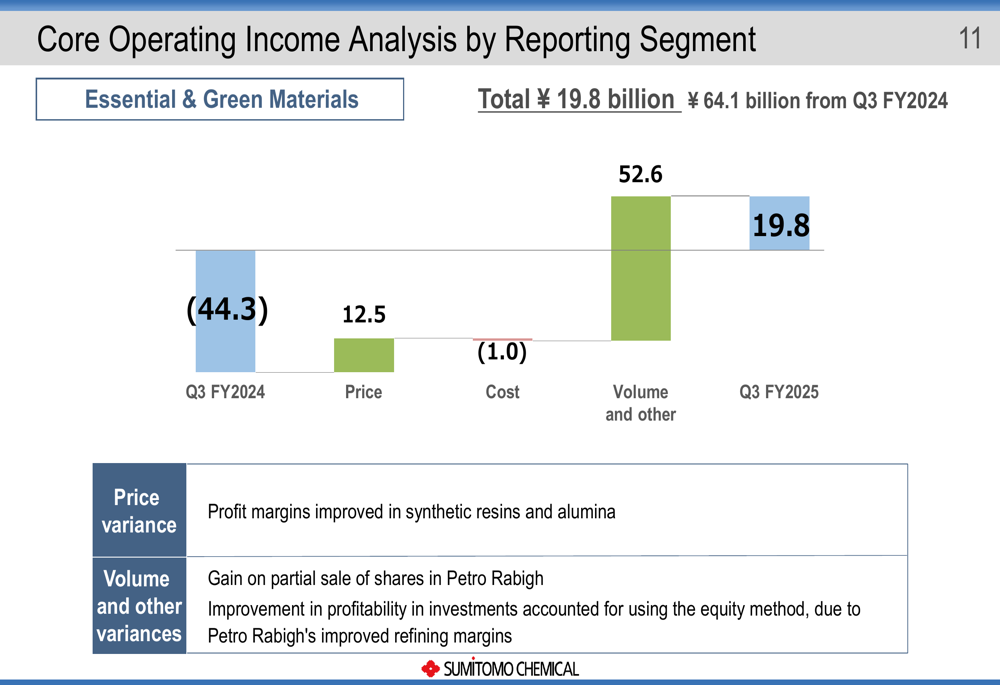 尽管收入下降,但核心营业利润在多个板块显示出显著改善。住友制药表现尤为突出,为1868亿日元的总核心营业利润贡献了1112亿日元。基础与绿色材料板块也显示出显著改善,从去年的亏损转为盈利。