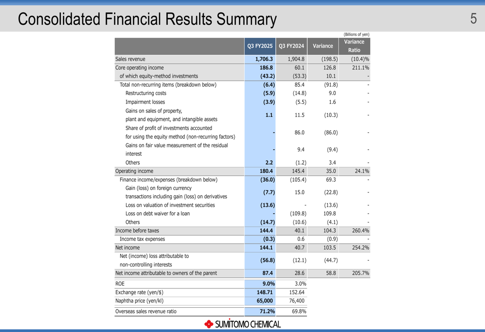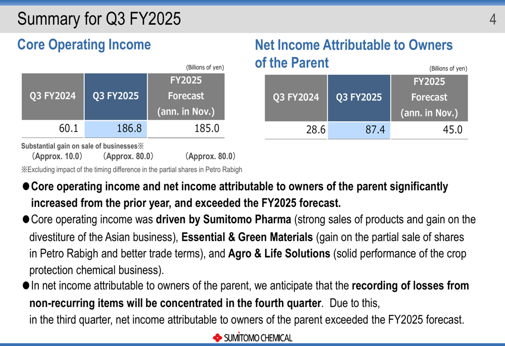 住友化学报告2025财年第三季度核心营业利润为1868亿日元,比去年同期的601亿日元显著增长211.1%。归属于母公司所有者的净利润增长超过三倍,达到874亿日元,较2024财年第三季度的286亿日元增长205.7%。这些令人印象深刻的利润数据是在销售收入下降10.4%至17063亿日元的情况下取得的。