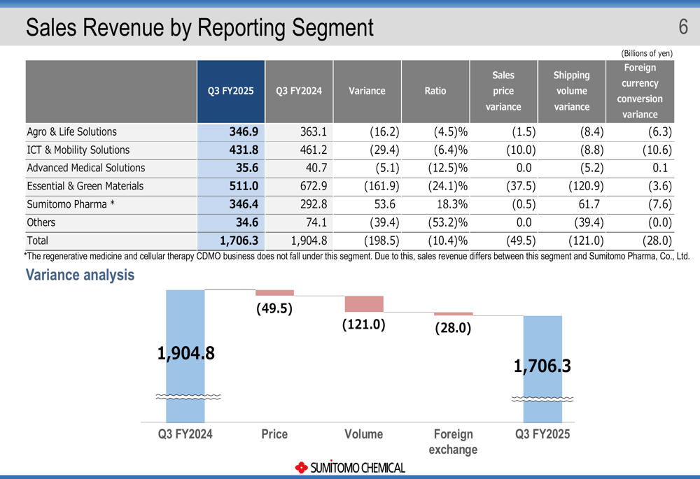 住友化学的财务业绩反映了其基本结构改革的影响,特别是在住友制药和基础与绿色材料板块。公司的战略性剥离为其核心营业利润贡献了约800亿日元,展示了其投资组合优化战略的有效性。