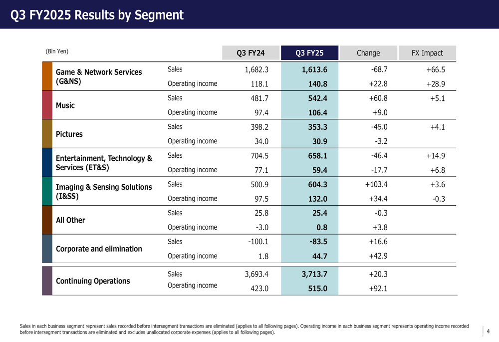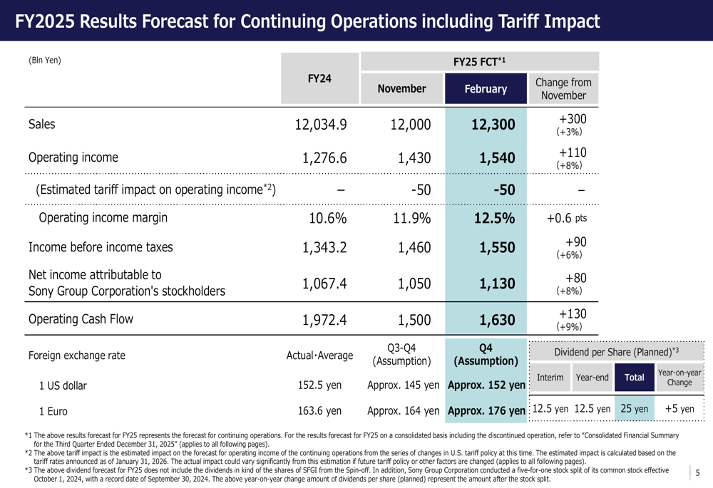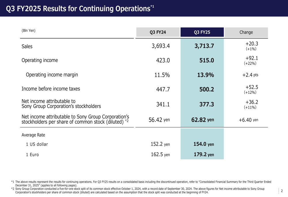 本季度的一个重要变化是索尼金融集团(SFGI)于2025年10月1日生效的部分分拆,这改变了公司财务业绩的报告方式。索尼现在将持续经营业务与金融服务业务分开报告。