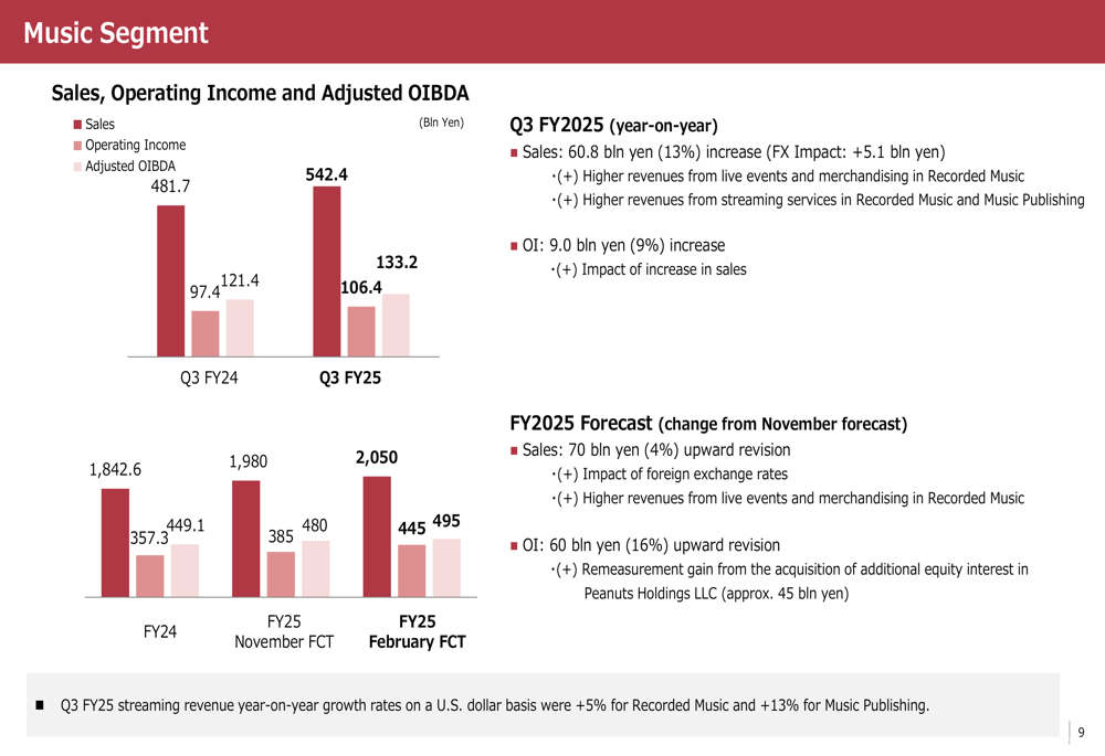 音乐部门表现强劲,销售额增长13%至542.4亿日元,营业利润增长9%至106.4亿日元。这一增长主要来自录制音乐领域的现场活动和周边商品收入增加,以及录制音乐和音乐出版领域的流媒体收入增长。以美元计算,录制音乐的流媒体收入增长5%,音乐出版的流媒体收入增长13%。