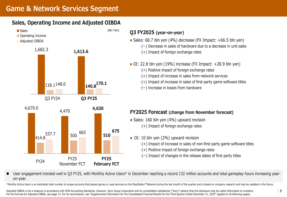 游戏与网络服务(G&NS)部门销售额下降4%至1,613.6亿日元,主要是由于PlayStation 5销量下降导致硬件销售减少。然而,营业利润增长19%至140.8亿日元,受益于汇率、网络服务销售增长以及第一方游戏软件销售增加。用户参与度保持强劲,12月份的月活跃用户达到创纪录的1.32亿账户。