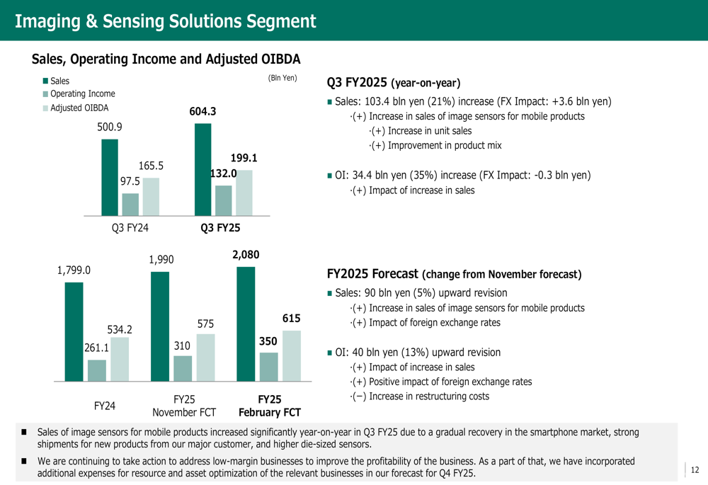 影像与传感解决方案(I&SS)部门表现突出,销售额增长21%至604.3亿日元,营业利润增长35%至132.0亿日元。这一增长主要来自移动产品图像传感器销售增加,反映了销量增加和产品结构改善。该部门受益于智能手机市场的逐步复苏、主要客户新产品的强劲出货量以及更大尺寸传感器的增长。
