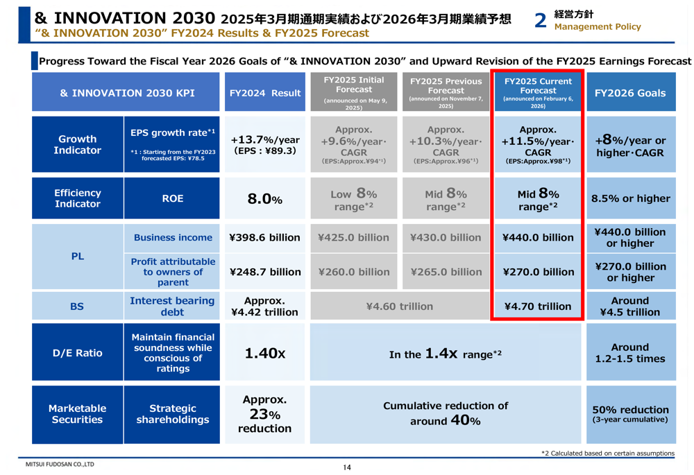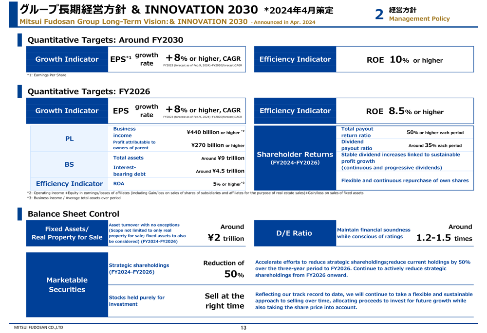 公司2030财年的长期目标包括保持每股收益增长率8%或更高(CAGR),实现10%或更高的ROE,为三井不动产在未来几年保持持续增长和盈利能力奠定基础。