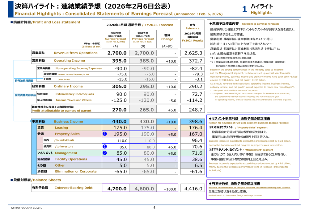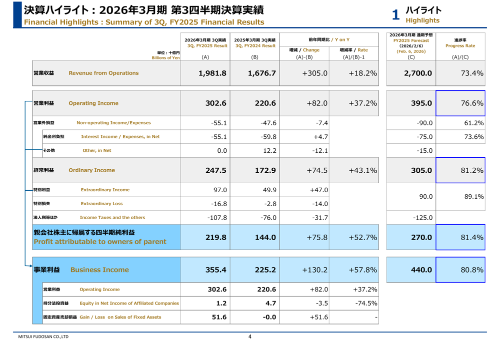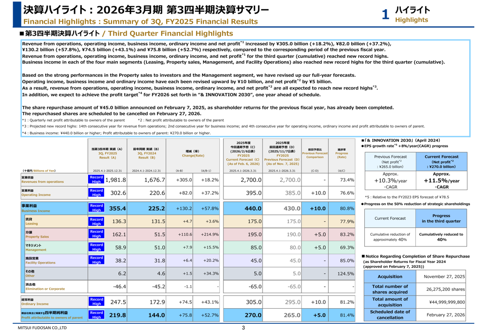 三井不动产株式会社(TYO:8801)于2026年2月6日发布了2025财年第三季度财务业绩,展示了各业务板块的卓越表现。这家日本房地产巨头报告了收入和利润指标同比大幅增长,并上调了全年预期。尽管业绩强劲,该公司股价在公告后仅温和上涨0.85%,交易价格为¥1,894.5。