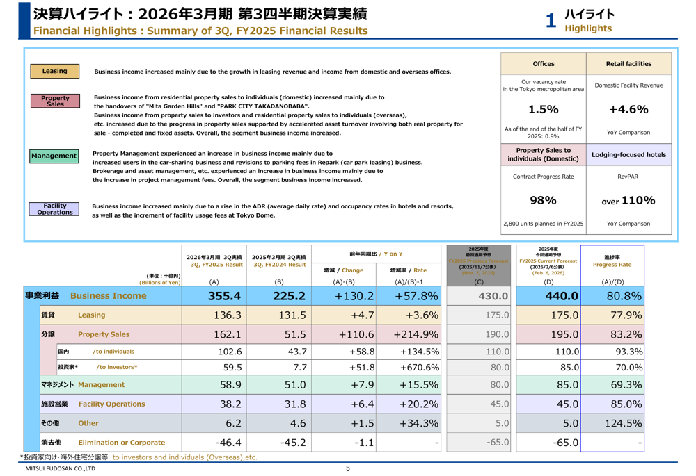 在日本房地产市场保持韧性的背景下,三井不动产的办公楼组合保持低空置率,住宅物业的合同率保持强劲。这些业绩展示了公司成功实施其战略愿景"&INNOVATION 2030",该愿景专注于通过核心业务发展和扩展到新资产类别来创造附加价值。