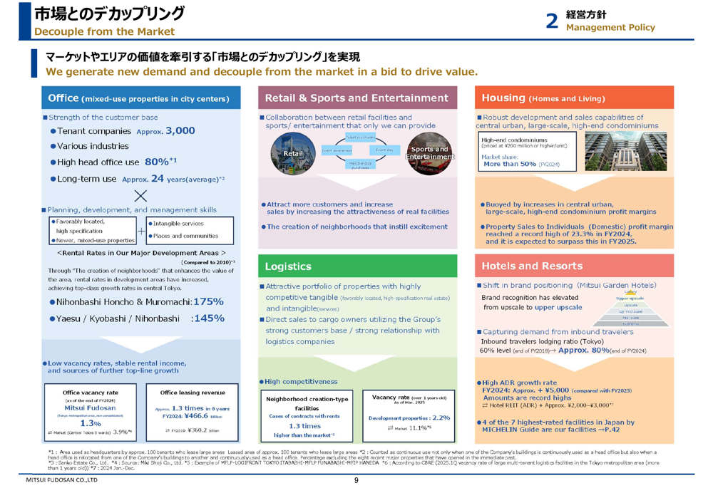 三井不动产的战略专注于"与市场脱钩",通过创造新需求并在各业务板块推动价值。公司在办公楼板块利用其强大的客户基础、高总部使用率和长期租约,同时在零售业务中强调零售设施与体育/娱乐之间的协作。