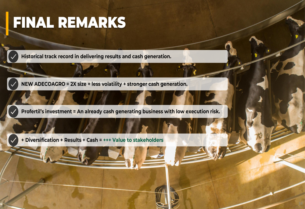 管理层强调公司"在交付业绩和现金创造方面的历史记录"作为其管理增加杠杆能力的证据。演示文稿强调Profertil代表"一项已经产生现金的业务,执行风险低",将其与绿地开发项目区分开来。