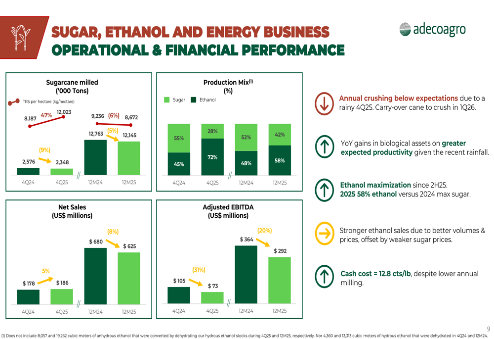 糖、乙醇和能源业务2025年调整后EBITDA为2.92亿美元,同比下降20%,收入为6.25亿美元。该分部压榨了1210万吨甘蔗,比上年下降5%,因为第四季度的多雨天气扰乱了运营。尽管年度压榨量较低,但公司将现金成本维持在每磅12.8美分的竞争力水平。