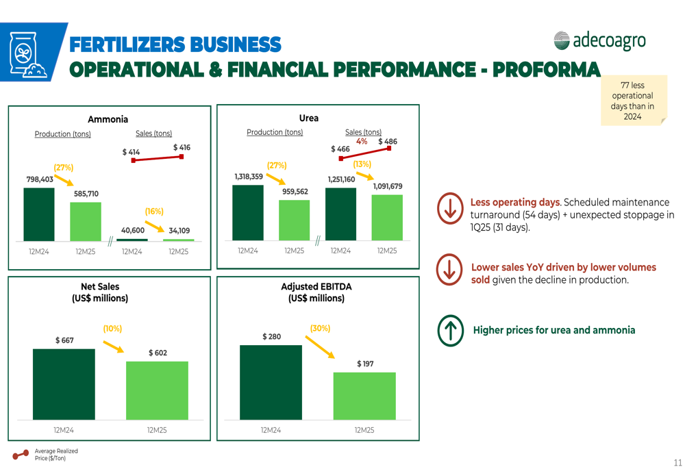 化肥业务在备考基础上呈现,2025年面临运营阻力,运营天数比2024年少77天。这导致氨产量为585,710吨(下降27%),尿素产量为959,562吨(同样下降27%)。尽管产量减少,该分部受益于尿素和氨价格上涨。