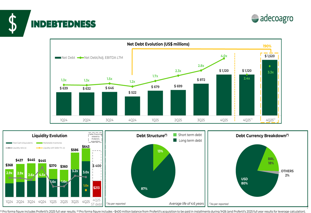 Profertil收购及相关融资活动对Adecoagro的资产负债表产生了重大影响。净债务从2024年底的8.72亿美元增加到2025年第一季度的11.2亿美元,预测显示根据最终收购付款时间,可能进一步增加到15.2亿美元。