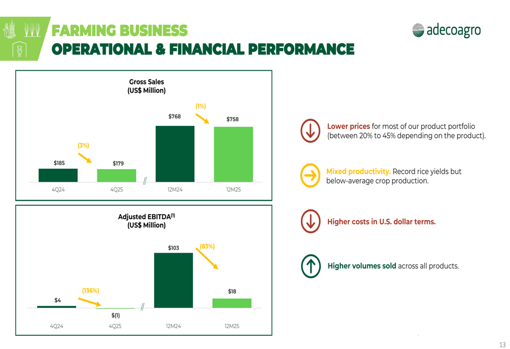 Adecoagro 2025年的独立业绩反映了其传统农业业务面临的困难市场环境。总收入达到14.46亿美元,同比下降2%,而调整后EBITDA下降38%至2.77亿美元。公司将这些结果归因于大多数产品的大宗商品价格下降(根据类别不同下降20-45%)以及以美元计价的成本上升。