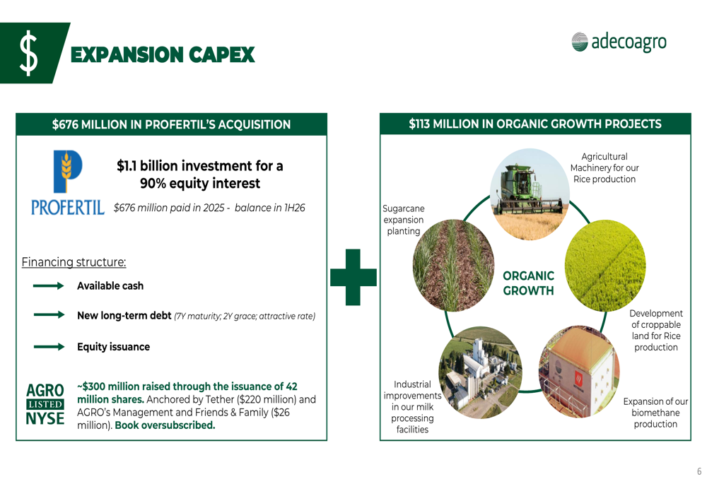 这笔11亿美元的投资需要在2025年支付6.76亿美元现金,余额将在2026年上半年支付。为了为这一转型交易融资,Adecoagro采用了多管齐下的方法,包括可用现金、带有两年宽限期的新七年期债务以及大规模股权融资。