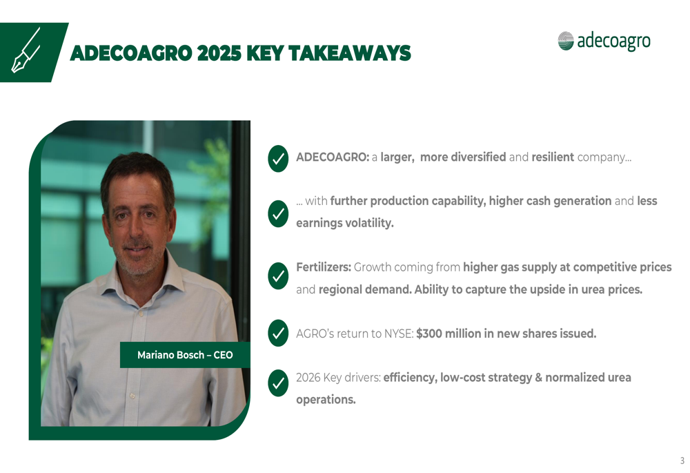 Adecoagro S.A. (NYSE:AGRO) 于2026年3月17日发布了2025财年全年业绩,重点强调了这一转型之年——以11亿美元收购化肥生产商Profertil,并重返纽约证券交易所交易。尽管大宗商品市场环境充满挑战,对传统农业业务造成压力,但该公司将自身定位为一家规模更大、更多元化、盈利波动性更低的企业。